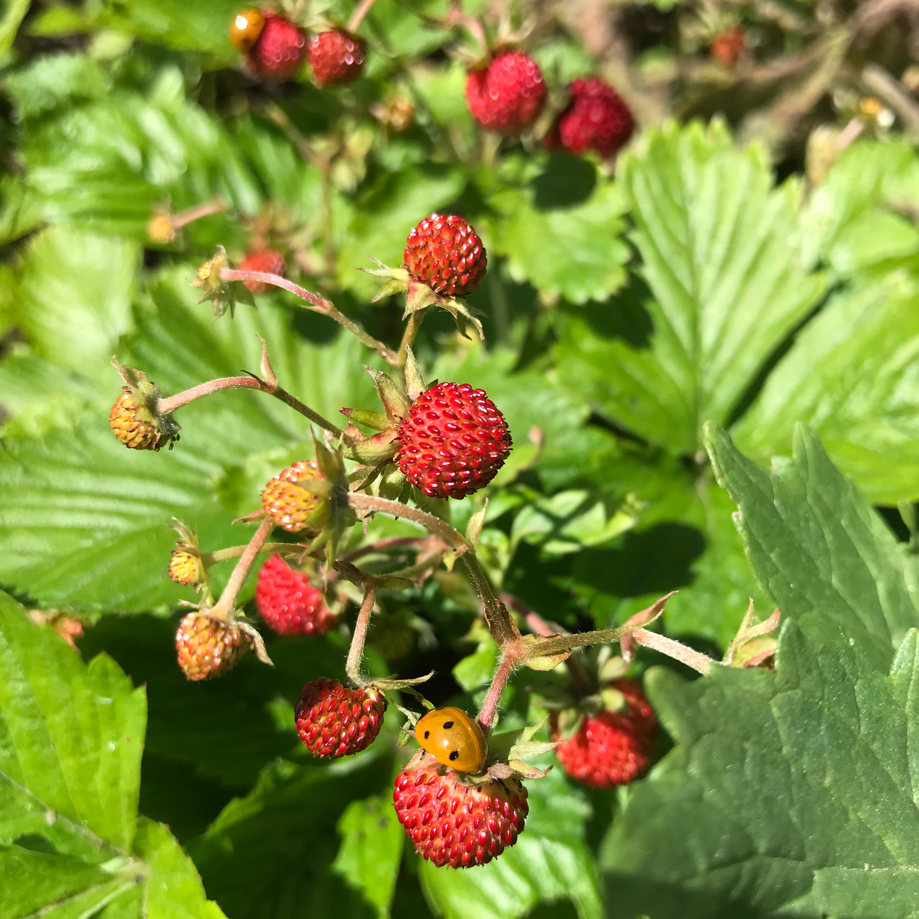 Het is eind mei en de grond van mijn stadstuintje is bezaaid met bosaardbeitjes.
