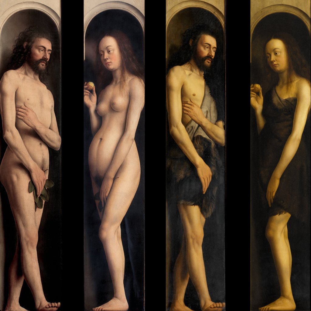 Detail Adam en Eva: links is de huidige versie met vijgenblad, rechts is een kopie gekleed in dierenhuiden door kunstenaar Victor Lagye, op vraag van de Belgische staat in 1861. J. & H. Van Eyck, De aanbidding van het Lam Gods, tempera en olieverf op paneel, 340 x 440 cm, 1432 (c) Sint-Baafskathedraal, Gent.